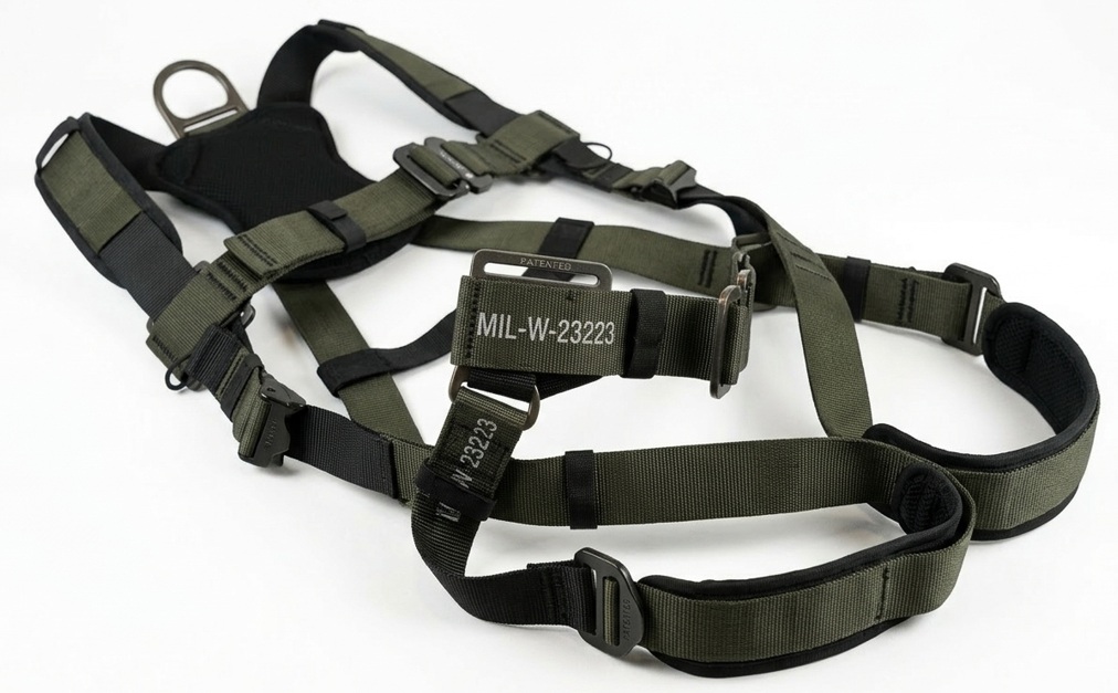 MIL-W-23223 Type I, II, III, IV, V, VI, VII, VIII, IX: les standards américains décrivent de nombreuses sangles pour la conception de parachute et d’harnais de sécurité. La sangle MIL-W-23223 est également employée dans ces secteurs. Avec une épaisseur plus importante et un tissage plat très dense, elle présente une résistance à la traction supérieure et une élasticité inférieure. Elle est principalement utilisée dans le cas de largage de plateforme militaire ou dans les liaisons nécessitant une résistance importante comme les sangles d’extraction.
