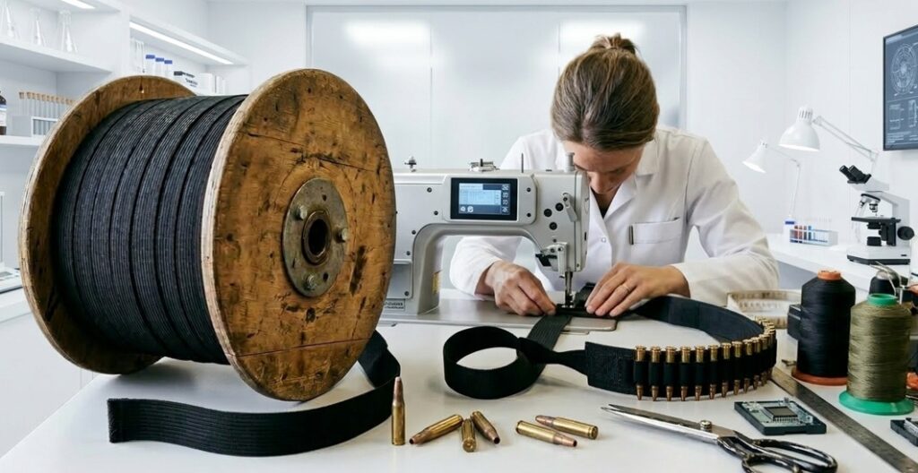 Cette sangle est très particulière car elle est très élastique. Elle permet donc le maintien d’un équipement, de munition, d’un masque, de lunettes… grâce à son élasticité.